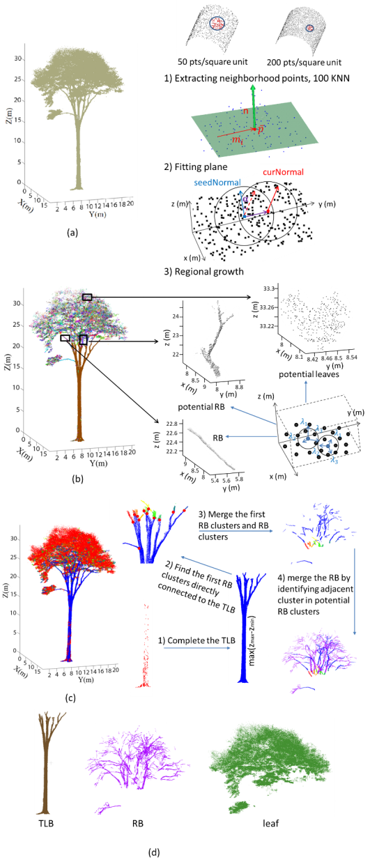 针对上述问题,论文提出了一种面向单木的无监督语义分割地基激光雷达点云的方法(图1)。该方法首先基于平面拟合残差和邻域关系对单木点云进行初始分割,有效提取点云中平滑且连通的区域;然后通过量化分段点云的几何特征来逼近分段木质、非木质特征;最后借助分段邻域关系和判别特征自下而上合并分段,实现树干和较大旁支、树枝以及树叶三部分的语义分割。此外,使用公开数据集中19种34棵树对该方法进行了验证评价,结果表明,该方法的平均分类精度为95.77%,可准确高效地分割点云。