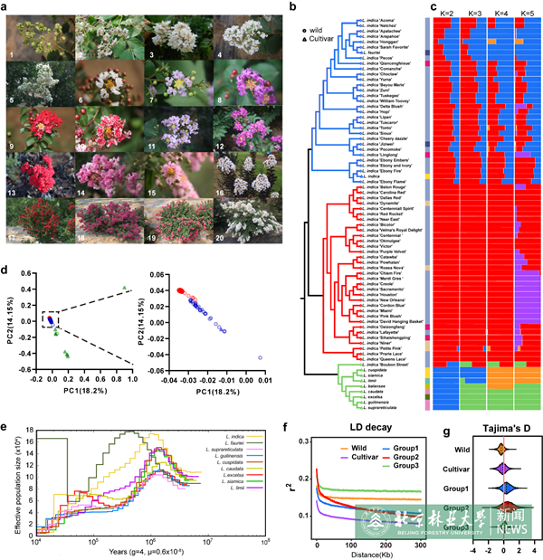 本研究采用PacBio技术完成了第一个紫薇高质量基因组de novo组装,通过Hi-C技术将基因组锚定到24条染色体上,锚定率99.97%,最终获得基因组大小为329.14 Mb(Scaffolds N50达13.85 Mb)。研究发现,在紫薇与石榴(Punica granatum)分化后(~35 MYA),紫薇经历了一个新的独立的全基因组三倍化事件。通过对73份紫薇种质资源进行全基因组重测序,验证了现代紫薇栽培品种的主要亲本为紫薇和屋久岛紫薇(L. fauriei)。通过成对序列马可夫共祖分析(PSMC)获得9种紫薇属植物1万年前至1000万年前的种群大小历史,在大约一百万年前出现了紫薇属植物种群规模的峰值,随后一直下降。在驯化过程中,许多植物的遗传多样性倾向于减少,但在紫薇中并未观察到这种现象。