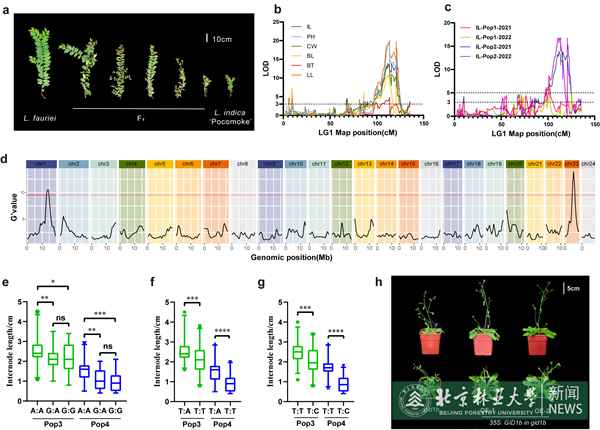 图3:紫薇遗传图谱及BSA分析共同定位节间长度性状调控区间