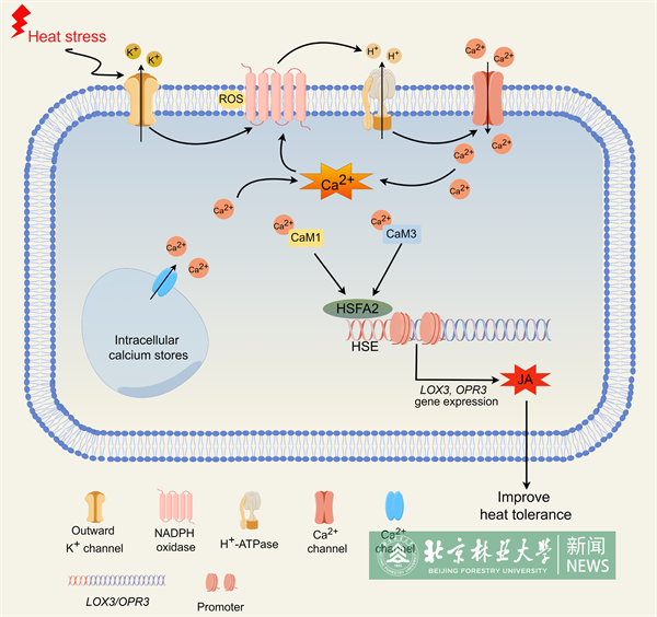 全球变暖会导致极端气候事件的发生,极端温度和热浪频率、范围和强度的增加都会造成粮食产量的巨大损失。研究植物细胞面临高温时如何感知和识别热信号,从而激活各种热防御反应的分子机理具有重要的科学意义。该研究揭示了从植物响应热胁迫的早期信号开始到最后茉莉酸(JA)合成提高植物耐热性的完整通路。
