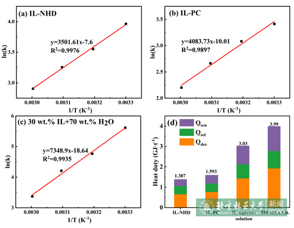 本研究设计了一种质子型的双功能化离子液体——二甲氨基丙胺三氮唑盐([DMAPA][TZ]),并在该离子液体的基础上与聚乙二醇二甲醚(NHD)复配制备了“智能”相变溶剂。在吸收过程中,溶剂自动分为富相和贫相,有助于减少再生所需的升温显热。研究进一步探究了物理溶剂(NHD或碳酸丙烯酯PC)对离子液体吸收性能的影响,并探究了该相变溶剂的抗腐蚀特性及其机理。分子动力学研究发现,阳离子[DMAPA]+与PC之间存在着更强的相互作用和更多的氢键,这可能使离子液体的溶剂化程度升高从而降低吸收负荷。量子化学计算表明,与传统相变溶剂不同,强极性离子[DMAPA]2+和CO32-离子的生成主导了相变过程。据溶剂在不同温度下的吸收负荷所计算,相变溶剂的反应焓仅有29.11 kJ·mol−1,再生能耗低至1.387 GJ·t−1(图1-图2)。此外,[TZ]−离子在金属表面的吸附,可以抑制Fe离子的自由扩散从而促进钝化层的生成(图2)。同时,NHD的水解抑制作用也有利于降低体系中电子受体的浓度,从而抑制阳极腐蚀。腐蚀及电化学实验表明,IL-NHD对20#碳钢的腐蚀速率仅有5M MEA水溶液的1/865。该研究为CO2相变吸收溶剂的设计与制备提供了新的策略与视角。