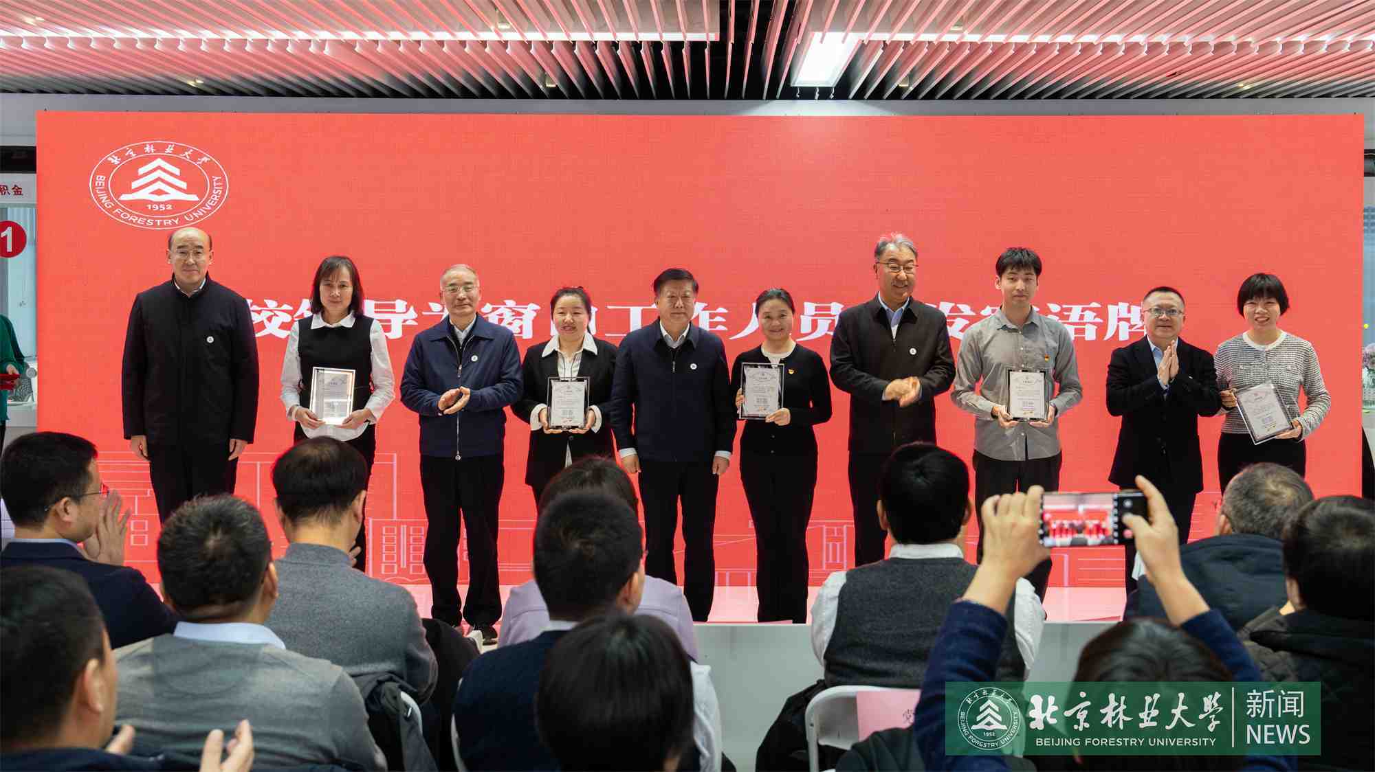 校领导为大厅工作人员颁发寄语牌,鼓励他们珍视初心、践行勉励,用不懈努力书写师生满意答卷。