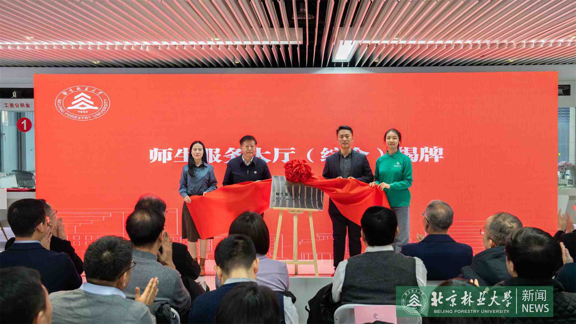 王洪元和师生代表共同为北京林业大学师生服务大厅(综合)揭牌,标志我校师生服务大厅(综合)正式启用。