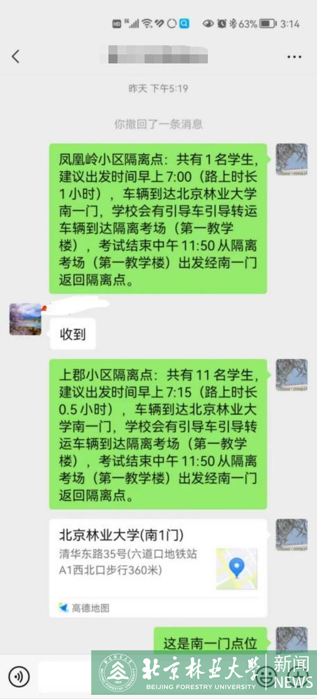 “老师,我们毛纺南小区刚通知要临时封控,我还能回校参加考试吗?”11月12日下午三点,园林学院的一名考生焦急地跟辅导员联系。学校在充分研判风险等级的基础上,协调由社区安排专人专车接送学生进校考试。