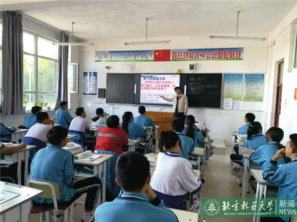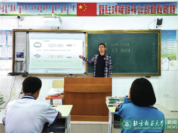 在开学第一课上,高鹏先给同学们展示了北京林业大学的校园生活,鼓励他们刻苦学习。在后续的课程中,他将北林的精神文化融入教学里,通过这些带给了学生们不一样的观察世界的角度与方法,让学生们能有低头走稳路的实干精神,也有抬头看世界的理想情怀,在学生们心中埋下了一颗信念的种子。