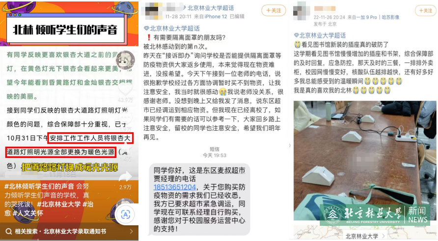 “努力倾听学生声音的北林,爱了!”在学校官微后台,每天都能收到来自学生热情洋溢的留言,而在抖音平台上,我校接诉即办的暖心举措收获了40余万网友点赞,近2万条留言。