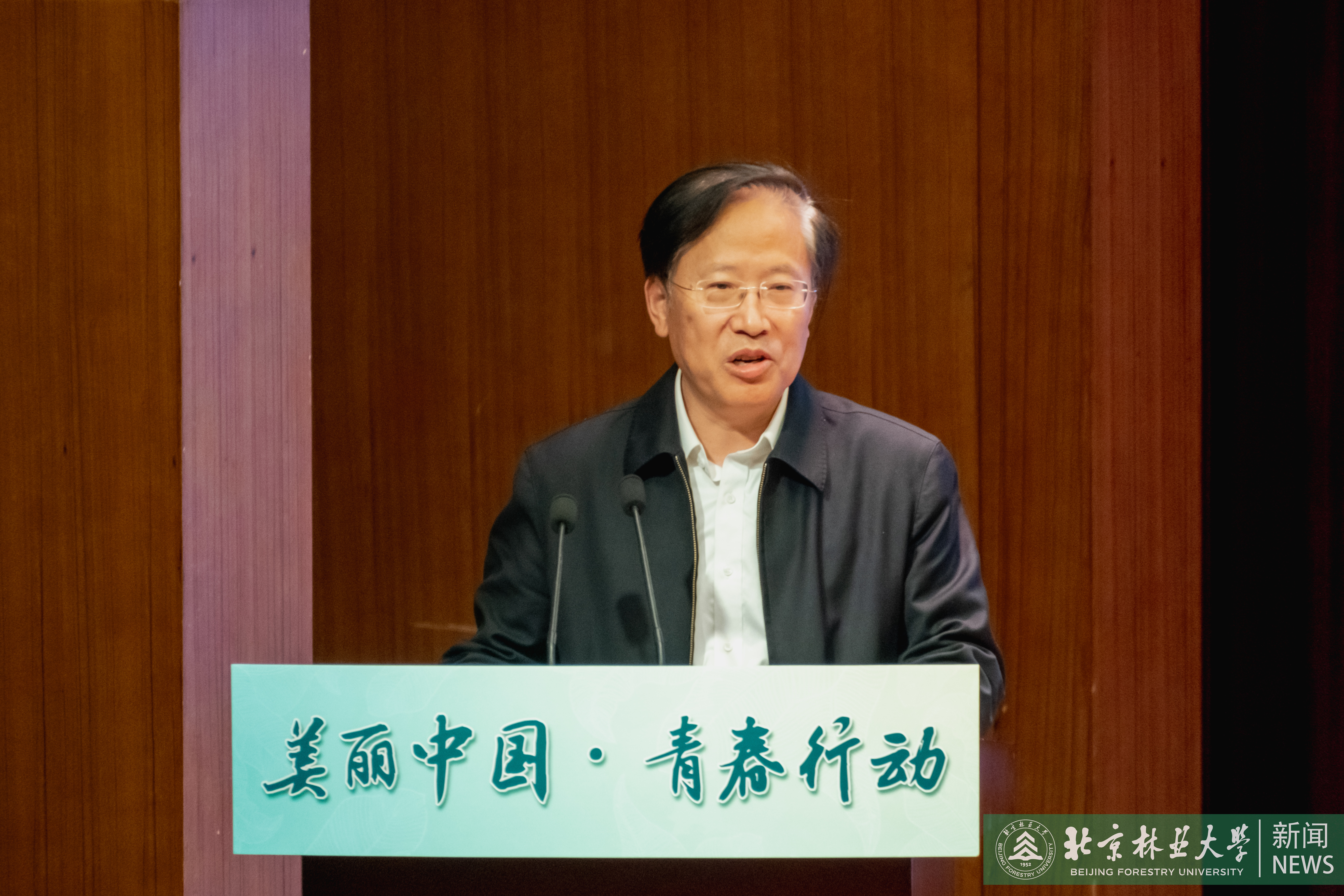 校党委书记王洪元致辞,他向长期以来关心和支持我校发展建设的有关部门领导和社会各界表示衷心感谢。他指出,我校作为“美丽中国”建设的高校排头兵,坚持用习近平生态文明思想指导办学实践:一是建强全国青少年生态文明教育中心,构建以学校教育为基础、覆盖全社会的生态文明宣传教育体系;二是依托高校和科研院所学科智力优势,持续开展青少年生态文明教育实践项目,形成高质量、有影响的学术成果和实践活动品牌;三是培养更多胸怀“植绿报国”理想的新时代青年,激励青年学子做习近平生态文明思想的忠实实践者。
