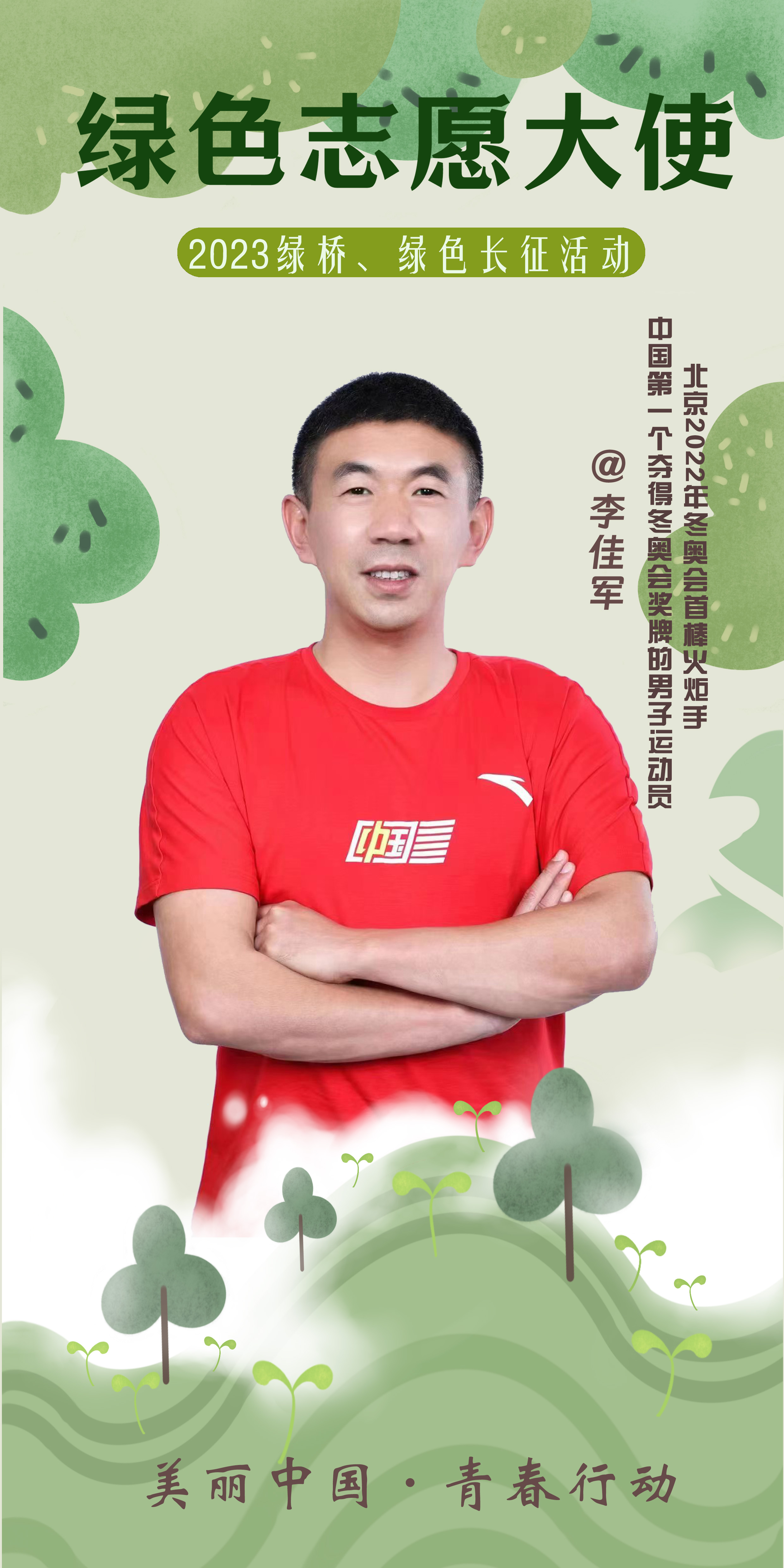 2023年绿桥、绿色长征活动聘请NPO绿色生命公益组织创始人兼理事长、第七届中华慈善奖获得者易解放,中国第一个夺得冬奥会奖牌的男子运动员、北京2022年冬奥会首棒火炬手李佳军,演员、全国青联常委佟大为,浙江省绿色科技文化促进会副会长、秘书长、中国青年五四奖章获得者忻皓为新一届“绿色志愿大使”。