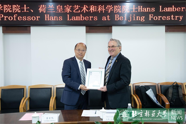 会上,李召虎为Hans Lambers教授颁发北京林业大学发展战略咨询委员会委员聘书。