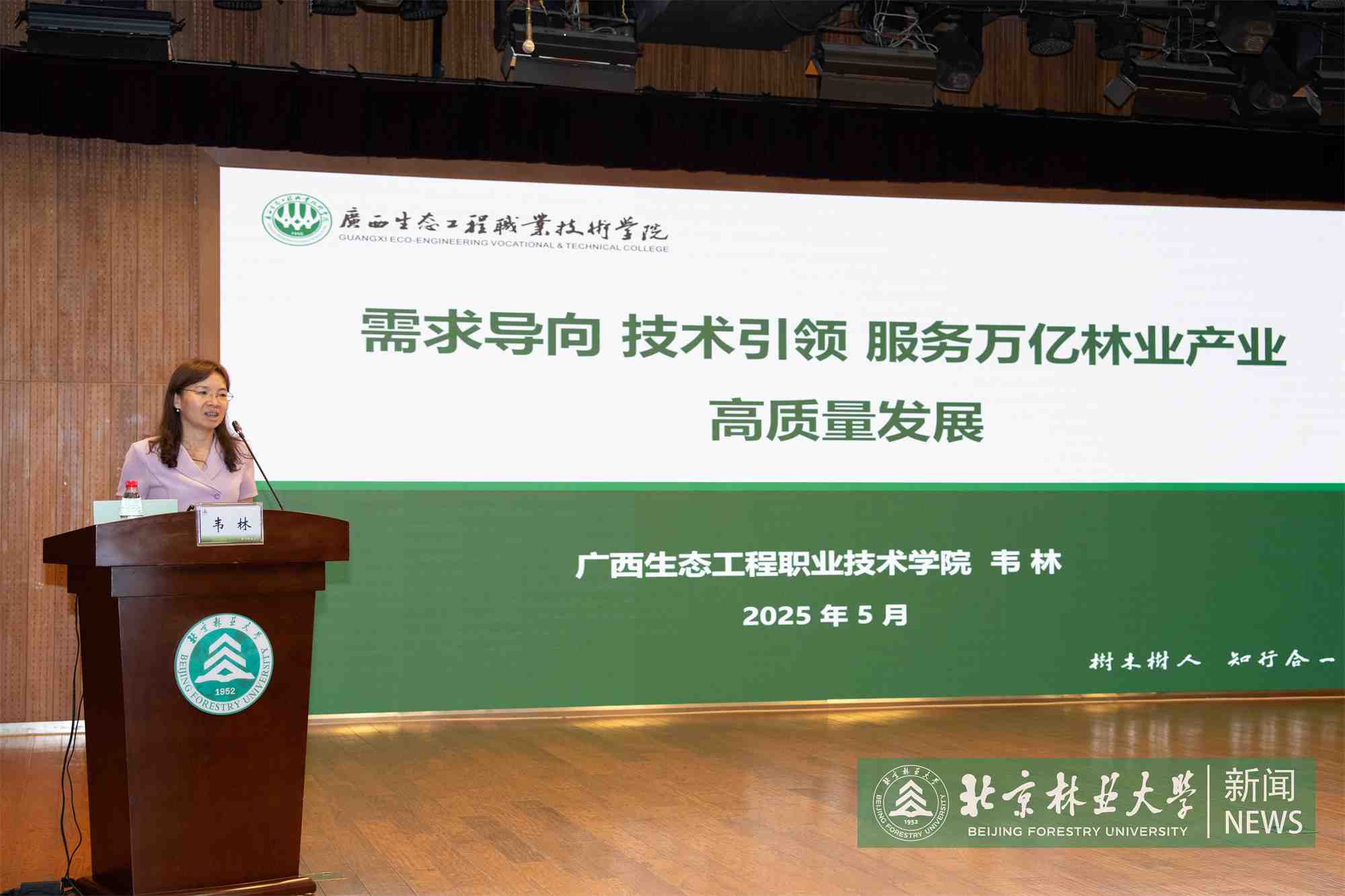 广西生态工程职业技术学院校长韦林作《需求导向 技术引领 服务万亿林业产业高质量发展》报告。她指出,广西生态工程职业技术学院积极服务广西现代林业产业发展,构建现代林业专业集群紧密对接广西现代林业产业体系建设,形成了“以生态技术为龙头,工程技术为主体,管理和服务为两翼,一二三产专业融合发展”的专业布局,并通过基地建设和先进技术引进课堂等形式赋能专业发展,搭建产教科融合融汇平台,积极拓展国际交流服务国际产能合作。她表示,未来将通过校企合作方式开展人才培养、教学资源开发和实训基地建设等工作,促进专业高水平建设,赋能林业高质量发展。