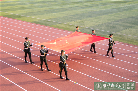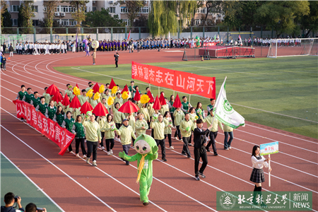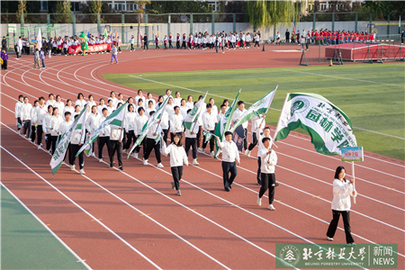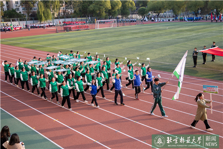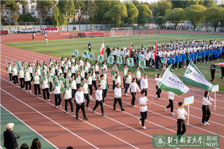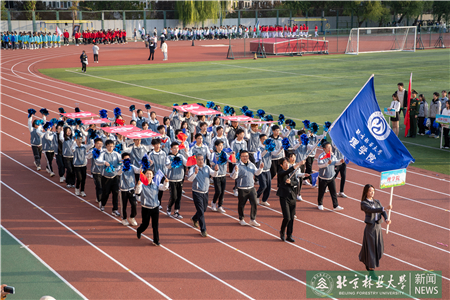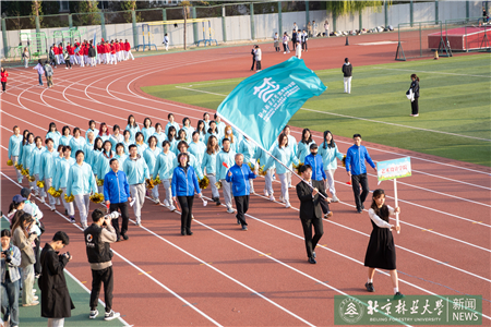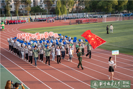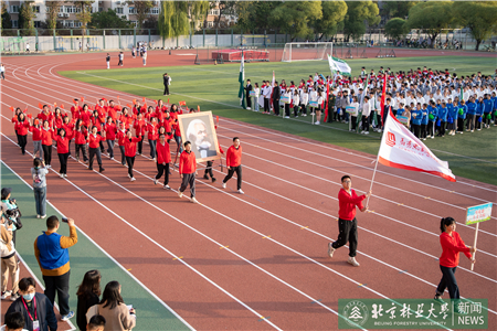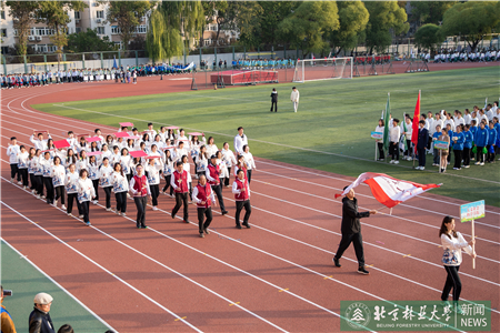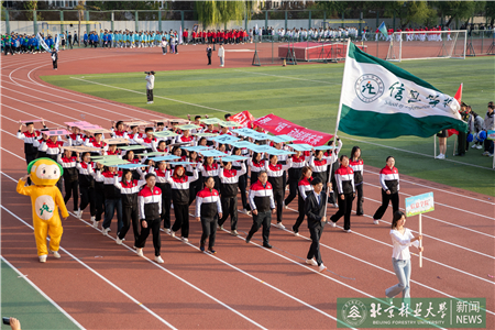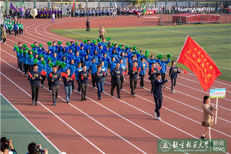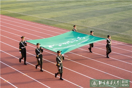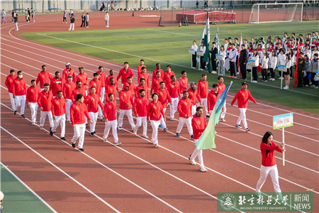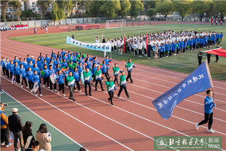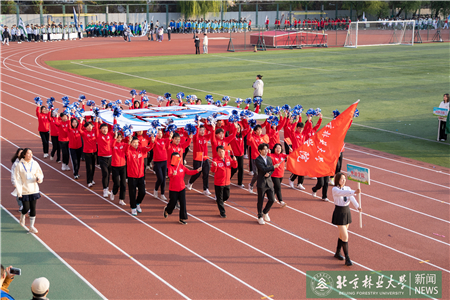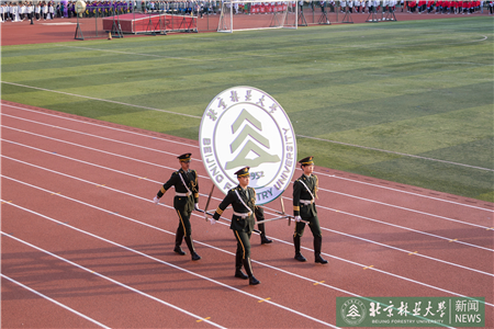 在开幕式现场进行了迎国旗、校旗、校徽和运动员入场仪式。伴随着激昂的《运动员进行曲》,各学院的运动员代表们在鲜花队和彩旗队的带领下,身着统一的服装,迈着铿锵有力的步伐入场,坚毅的脚步展现着北林学子的青春朝气。升国旗、唱国歌仪式随后举行。